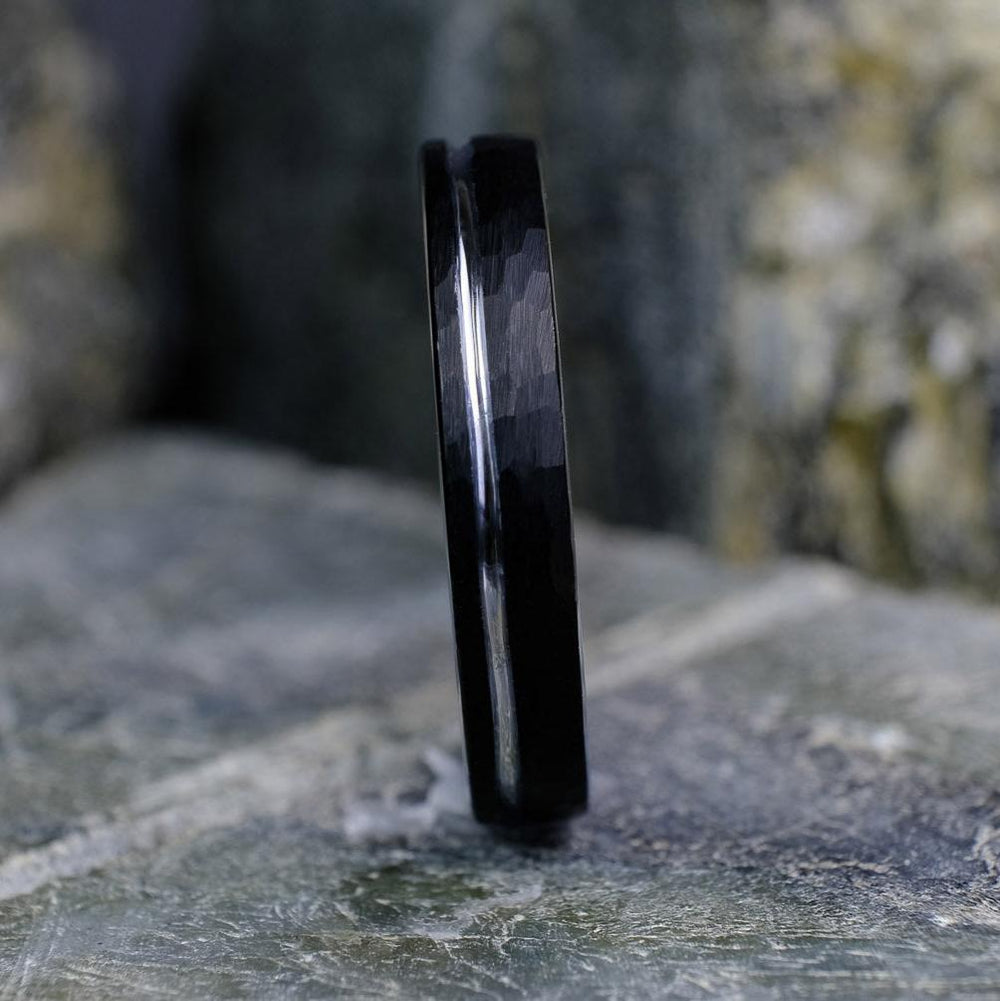 Perfect as a wedding band, promise ring, or stylish accessory, this unisex band combines rugged charm with modern sophistication. Enhance your look with the distinctive appeal of our black hammered ring featuring a silver stripe and interior.
