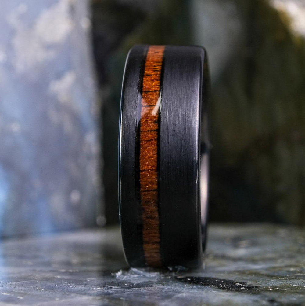 Perfect as a wedding band, promise ring, or standout accessory, this unisex band combines the natural beauty of Koa wood with the modern elegance of brushed black. Elevate your look with the distinctive appeal of our Koa wood stripe ring.