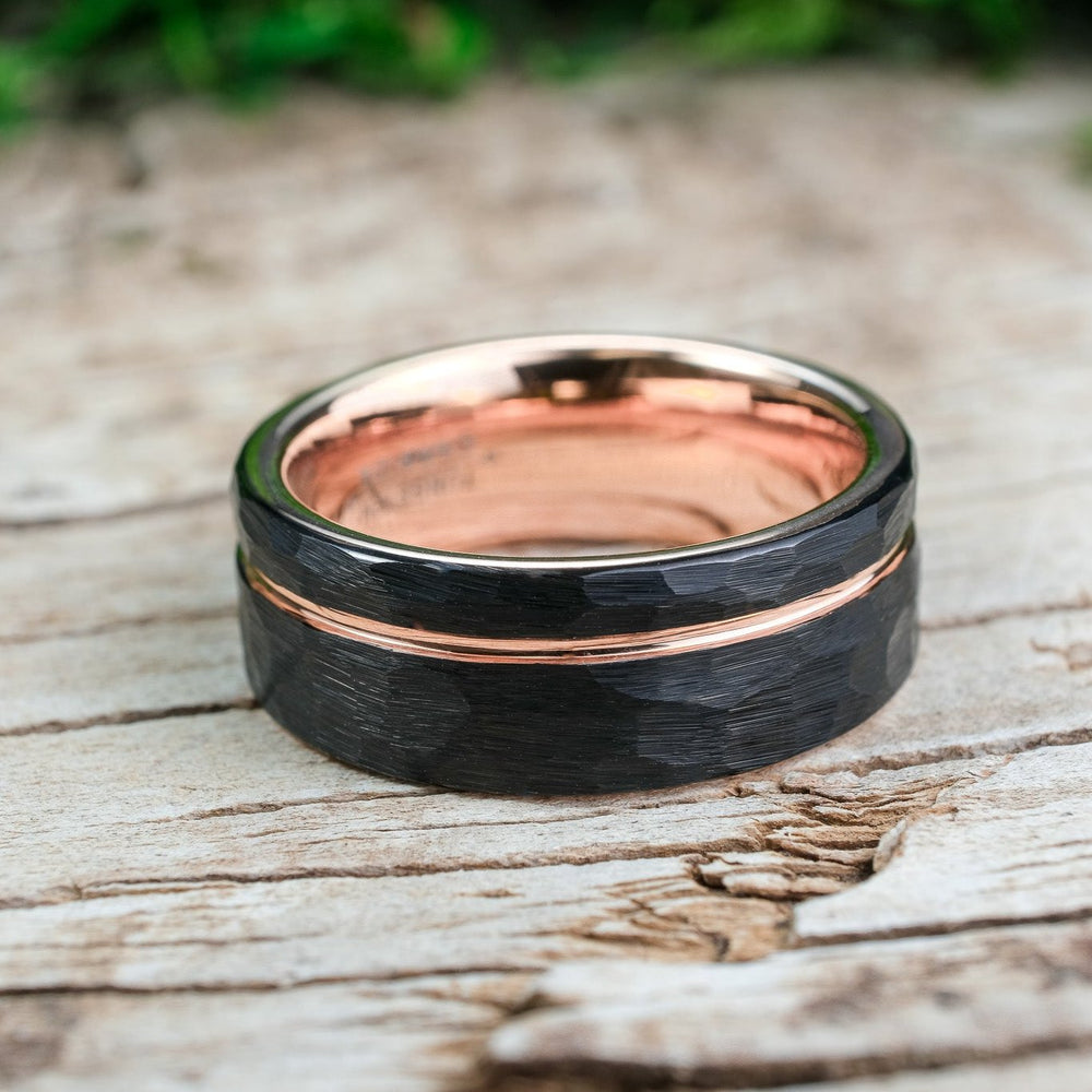 Experience the bold texture and modern sophistication of our Hammered Black Band with Rose Gold Stripe. This 8mm wide ring is perfect for those who appreciate a distinctive and stylish accessory.